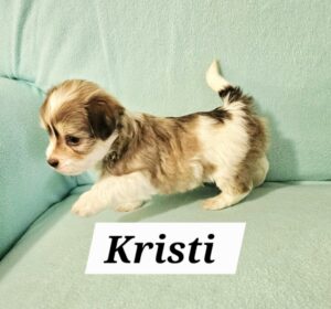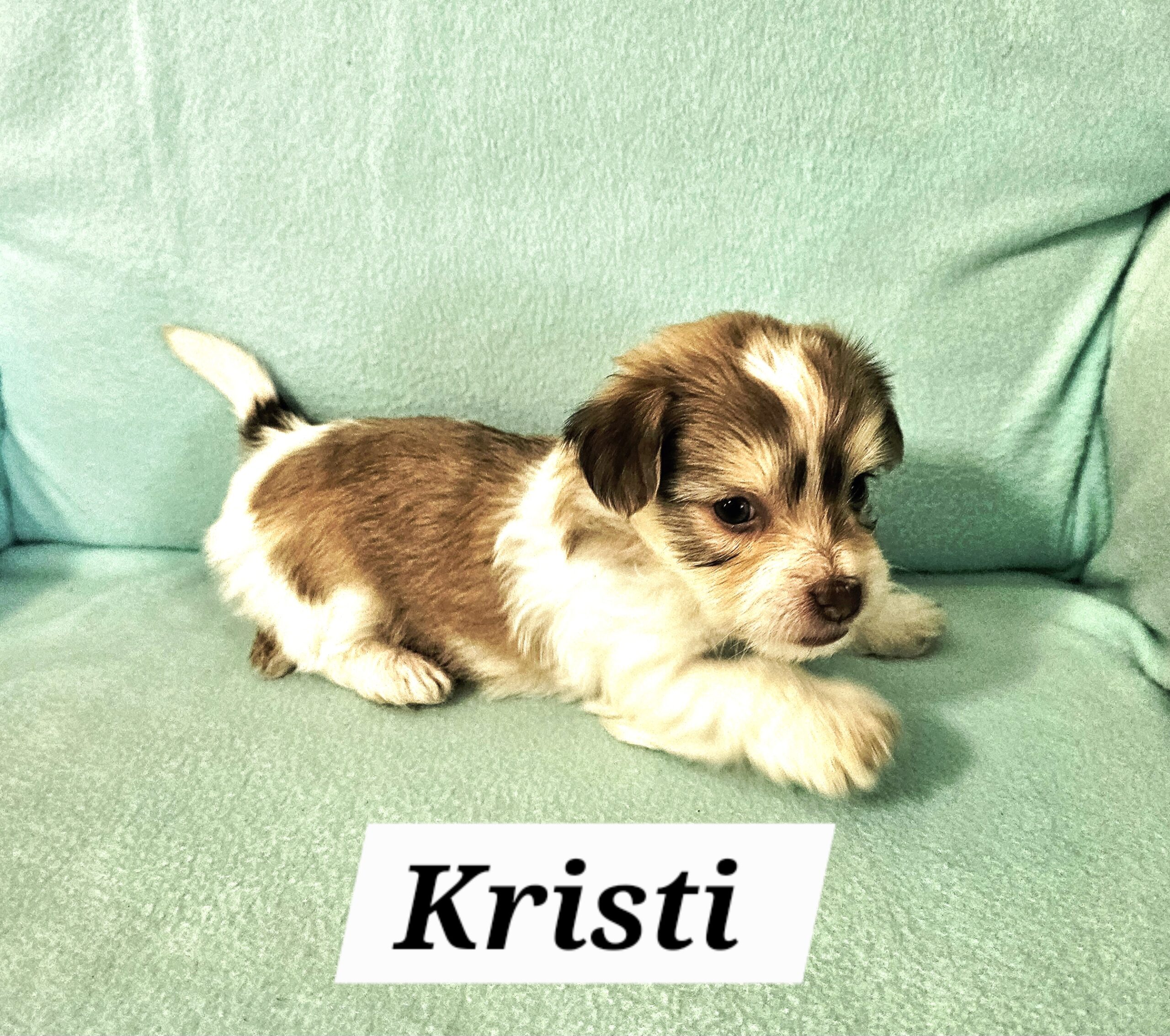 Kristi is tan and white parti. I am not sure if she will turn out to be a chocolate or not.. This is the biggest pup in the litter. I think she could end up being about 12#
